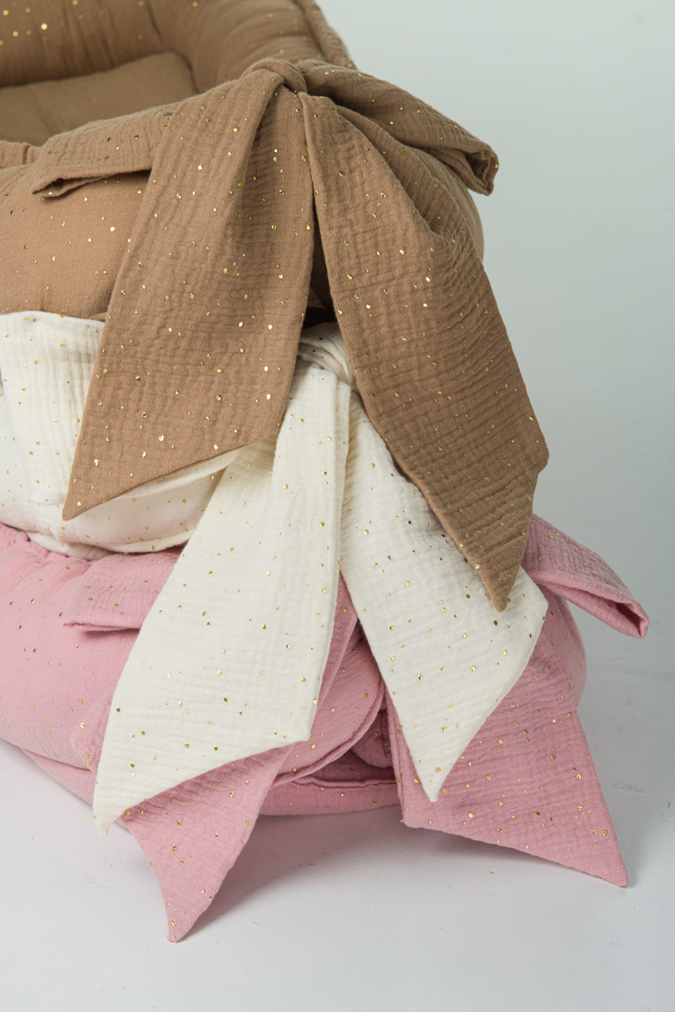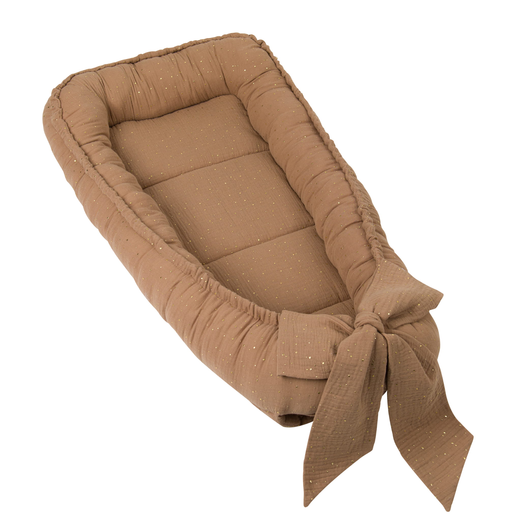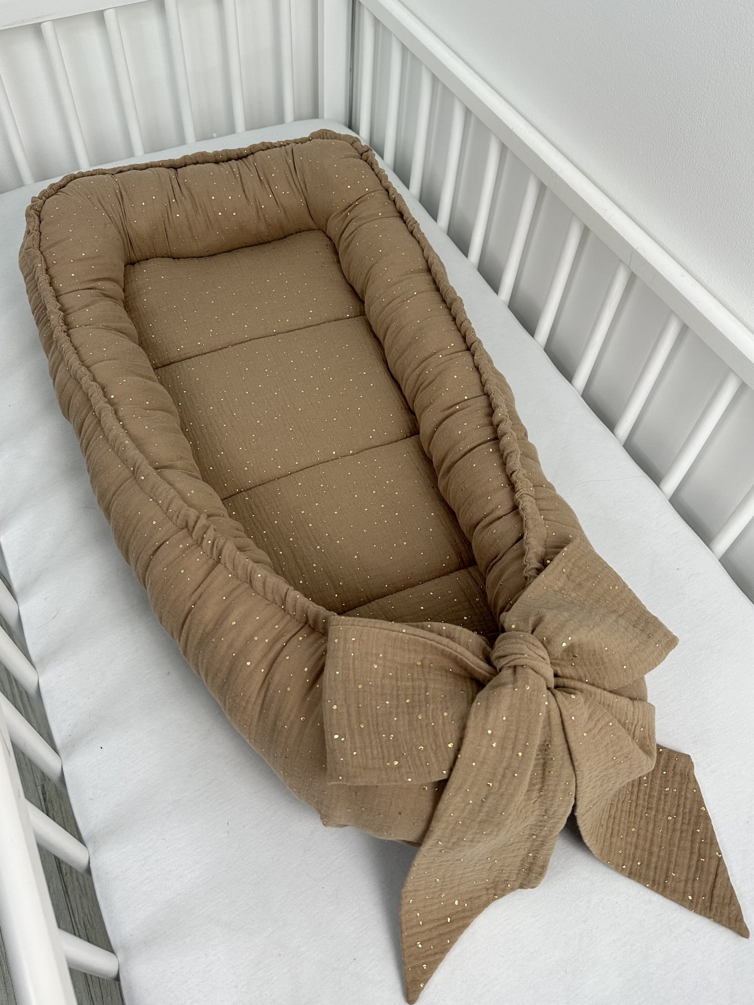 Kokon niemowlęcy z kokardą MUŚLINOWY Beżowy w złote kropki