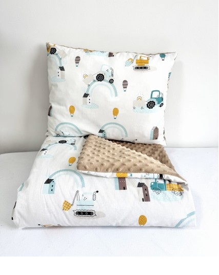 Komplet do przedszkola / żłobka - kocyk / kołderka z poduszką Miętowe koparki i beżowe minky