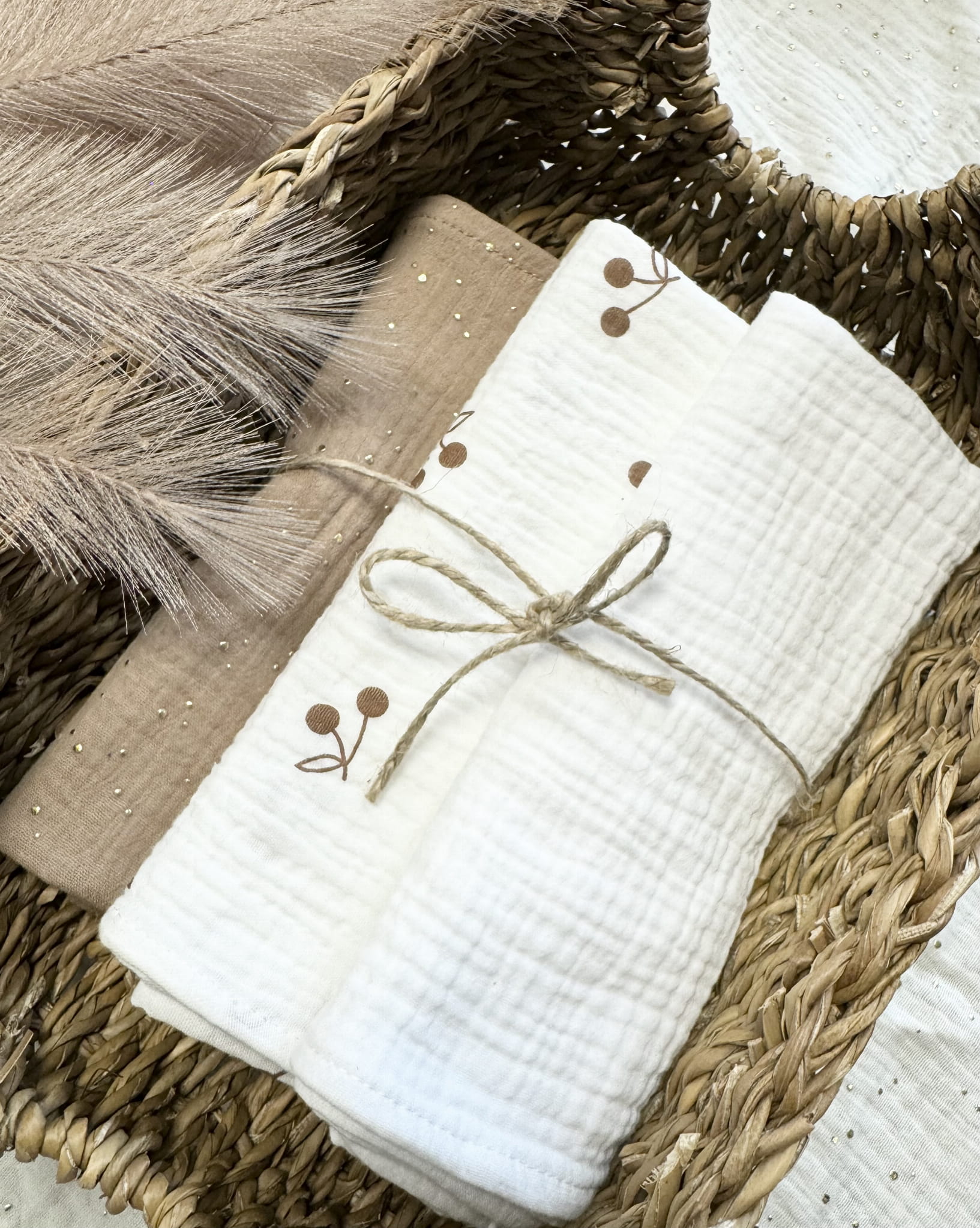 Zestaw 3 pieluszek muślinowych zapakowanych w ozdobny kartonik.